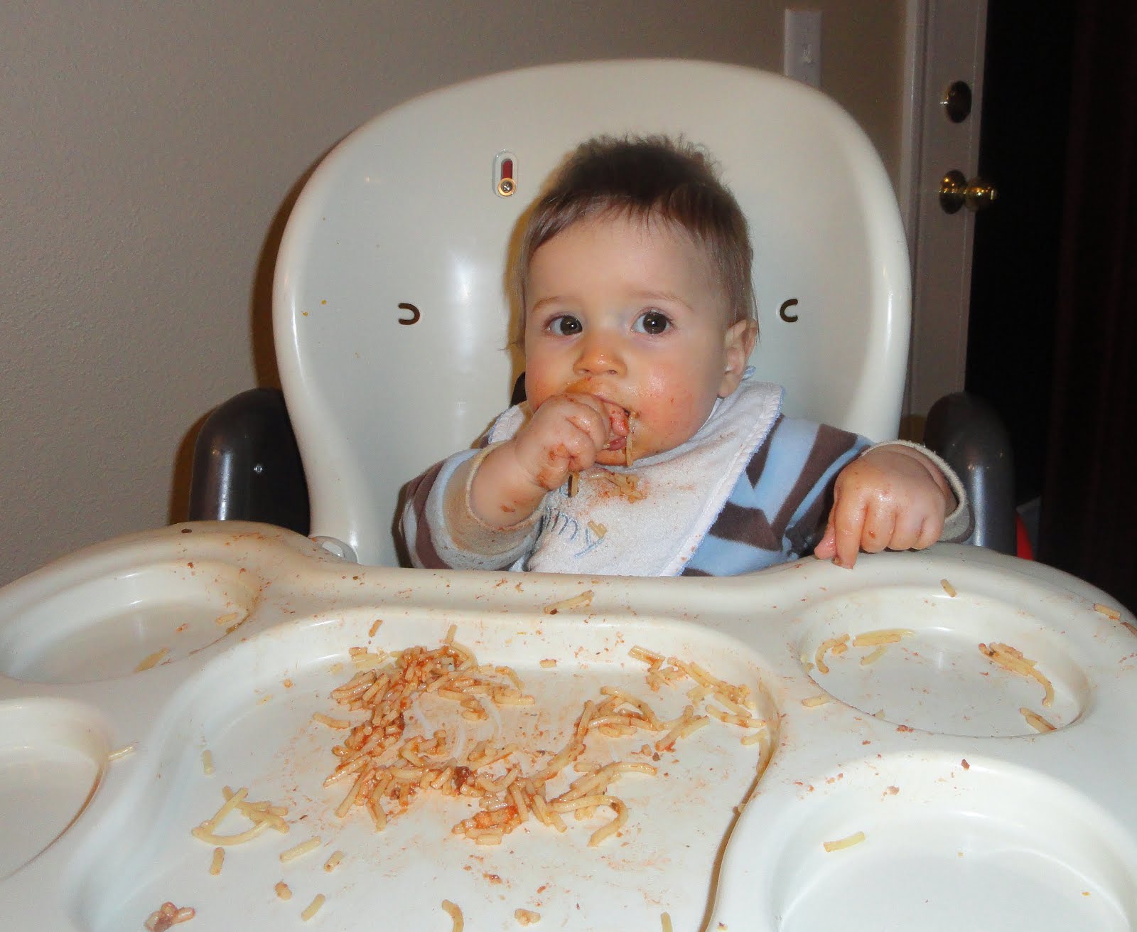 * he loves eating new foods. Non baby foods he tried-peaches, garlic mashed potatoes, chicken nuggets, spaghetti and pizza. (Of course he only eats little bites of the real food.) I was surprised with the garlic mashed potatoes but he really dug them! It's alot more messy letting him eat real food but fun to share our dinners with him. Thankfully I got a Kirby vacuum!